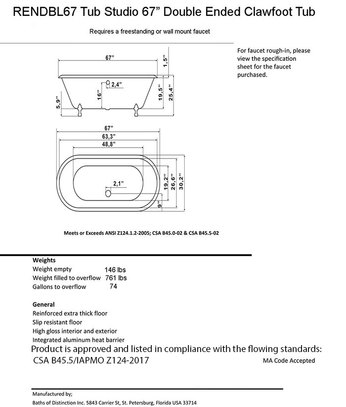 This fabulous double ended clawfoot tub has a high gloss white interior and exterior with a slip resistant floor. TheHLDB67 is an especially elegant double ended tub and it's narrow roll top lip, the result of which allows for additional width and leg length for relaxed bathing.